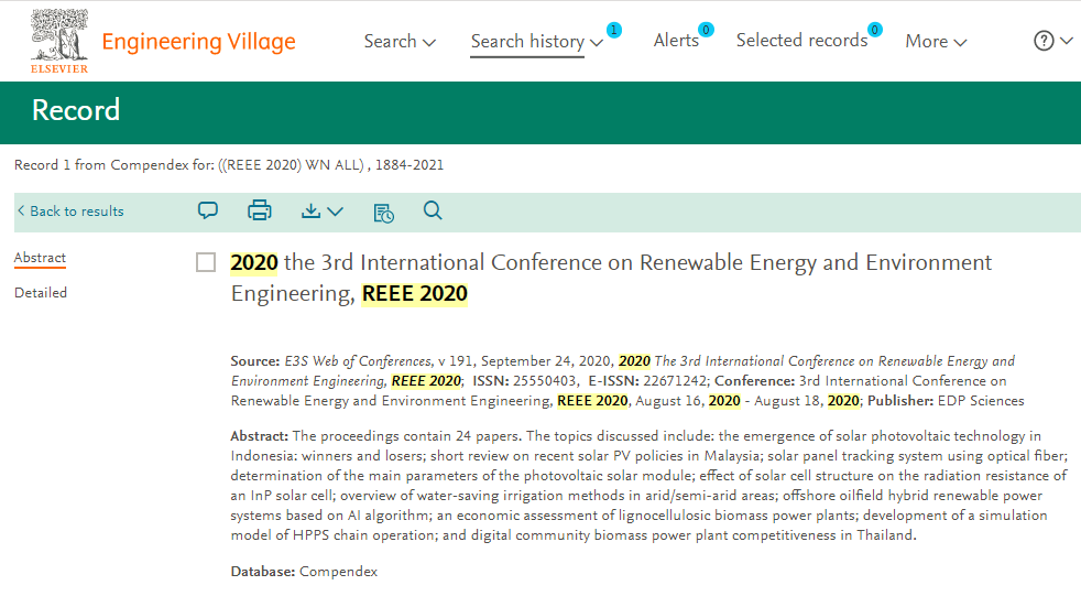 REEE 2020 proceedings are published in E3S Web of Conferences-Vol.191 (Online Linkage). Papers haven been indexed by EI Compendex & Scopus.